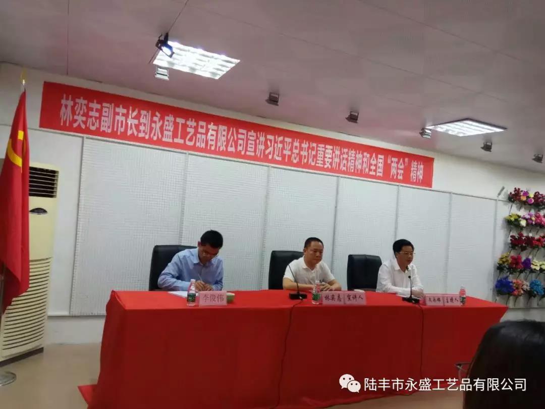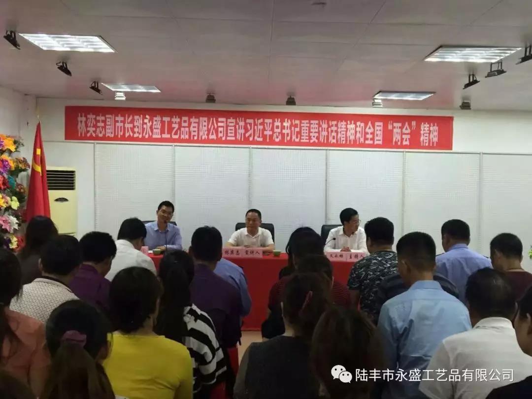 2018年4月12日下午,陸豐市政府副市長(zhǎng)、公安局長(zhǎng)林奕志到市永盛工藝品有限公司宣講習(xí)近平總書記重要講話精神和全國(guó)"兩會(huì)"精神,并作輔導(dǎo)報(bào)告。要求企業(yè)員工要切實(shí)把思想和行動(dòng)統(tǒng)一到習(xí)總書記重要講話精神和全國(guó)"兩會(huì)"精神上來(lái),學(xué)深悟透,做到真學(xué)、真懂、真信、真用,全面理解習(xí)近平總書記關(guān)于科技創(chuàng)新的指示和要求,用于指導(dǎo)企業(yè)發(fā)展,把創(chuàng)新思維作為企業(yè)發(fā)展的第一要?jiǎng)?wù),把人才作為企業(yè)的第一資源,把創(chuàng)新作為企業(yè)發(fā)展的第一動(dòng)力,推進(jìn)企業(yè)做大做強(qiáng)。